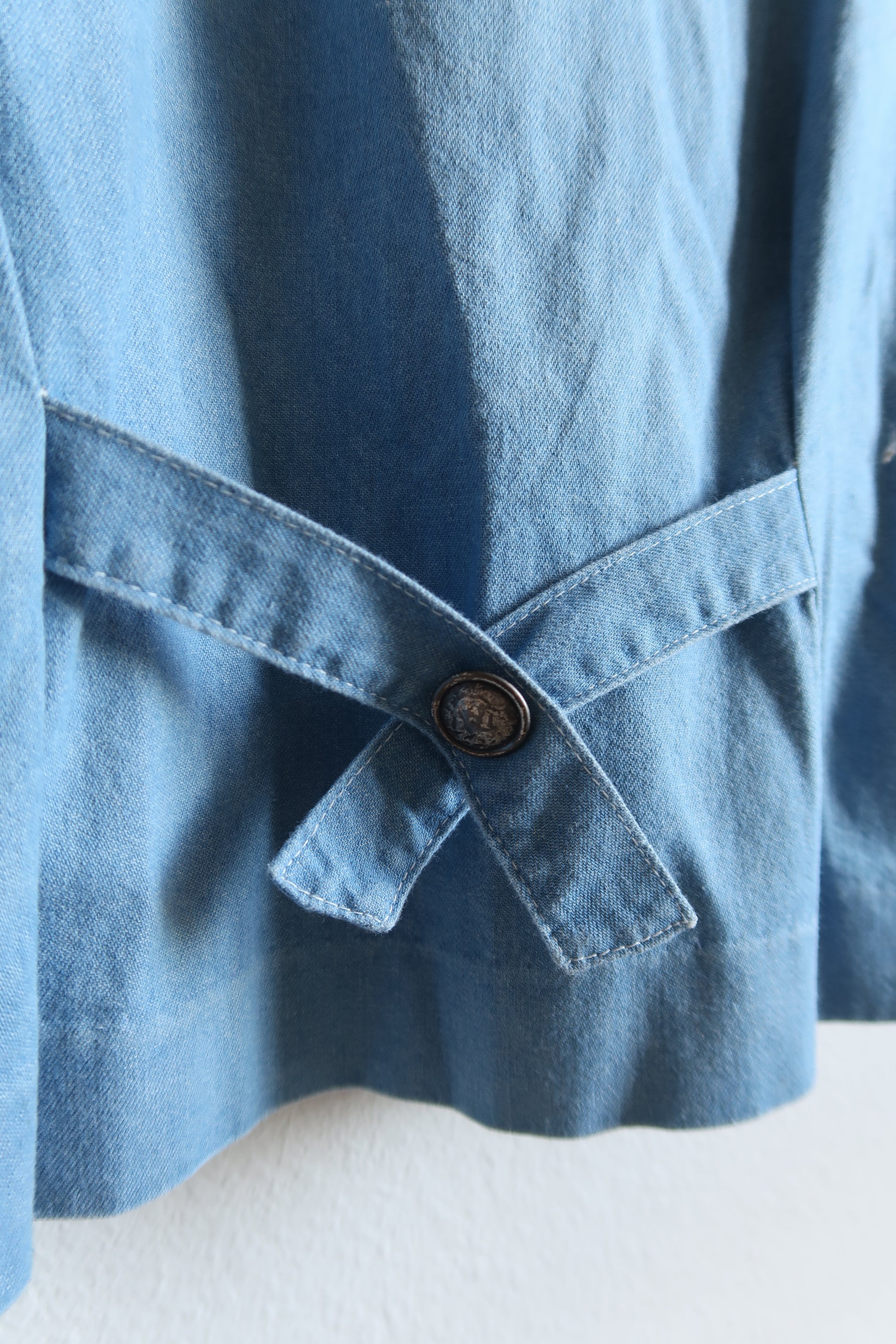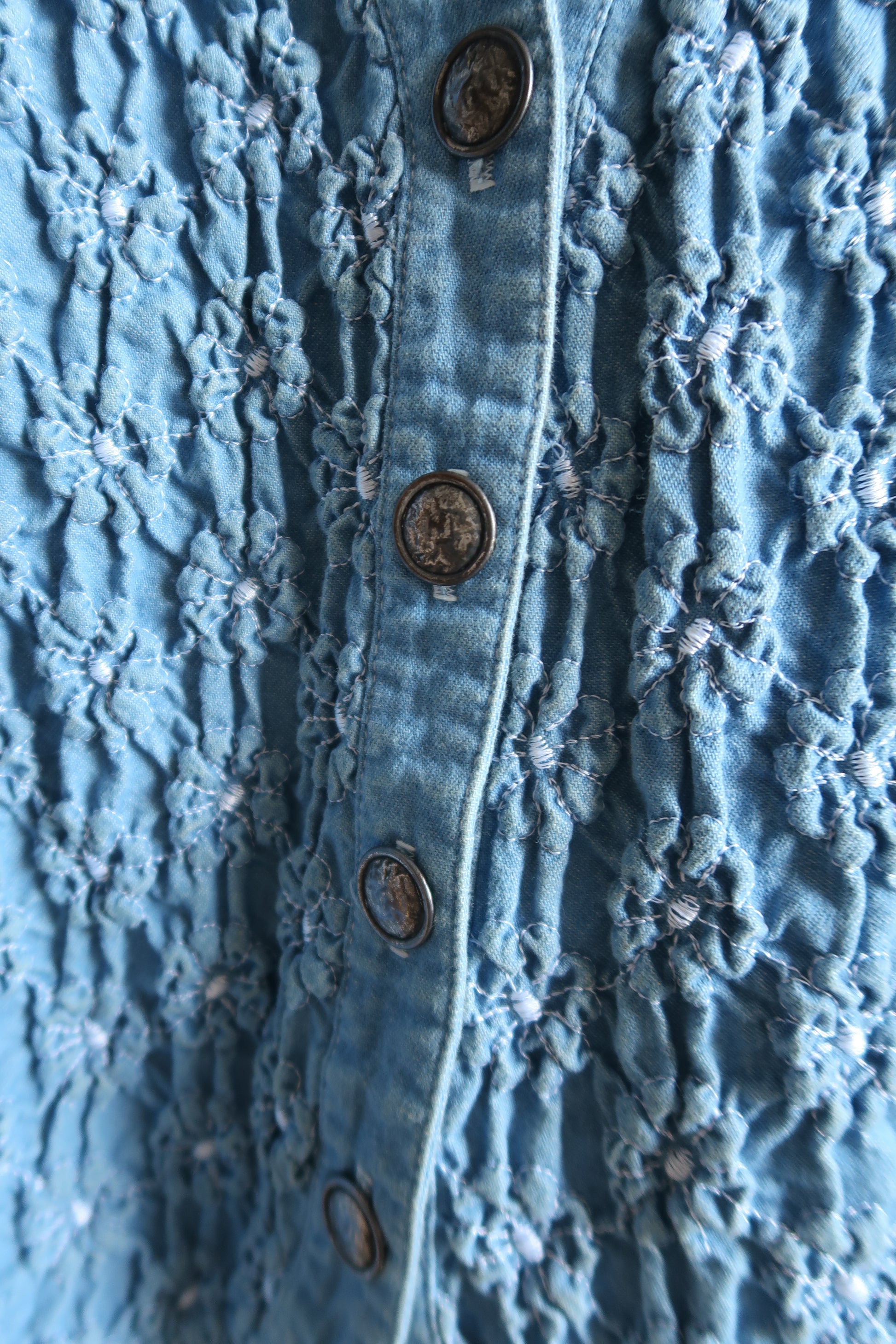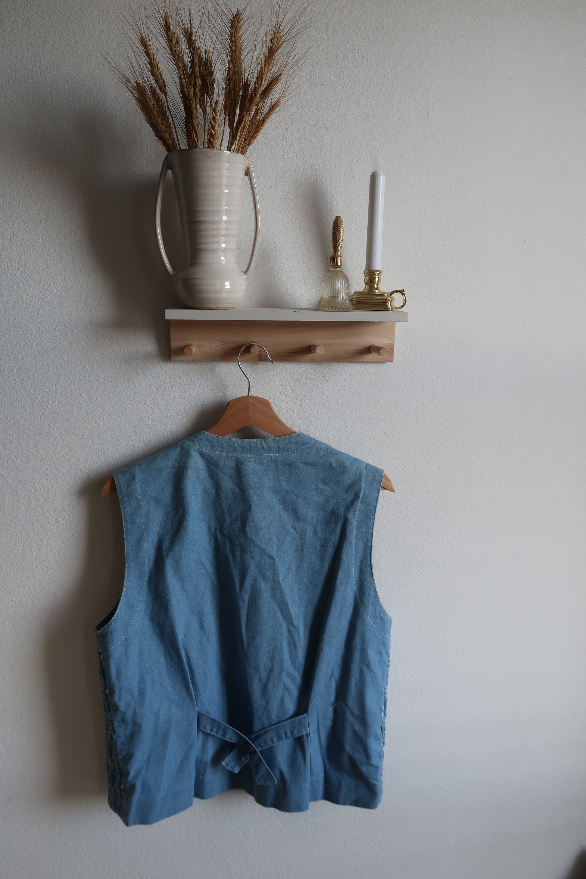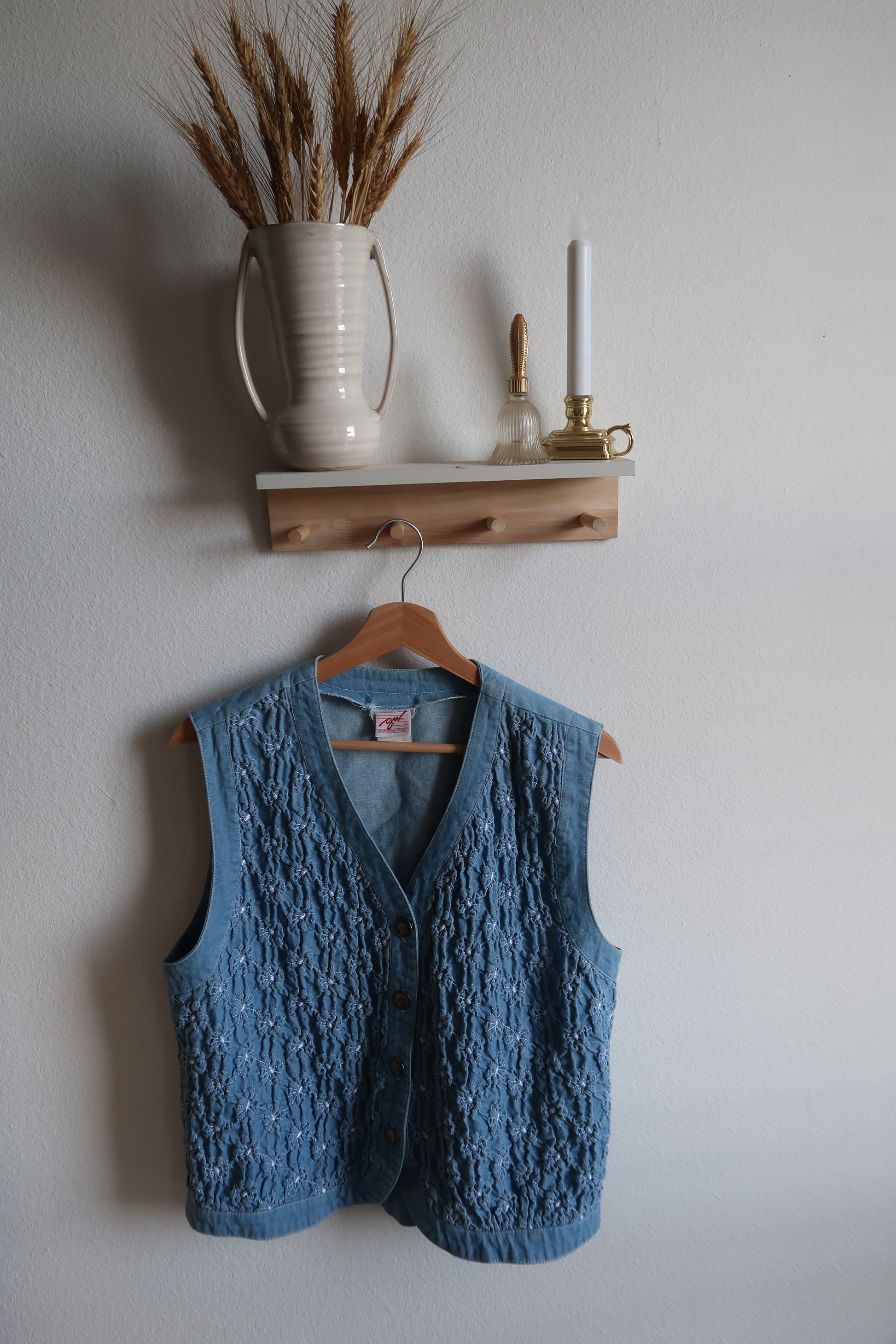 VTG GW Division of Graff Embroidered Jean Vest This vintage denim vest showcases authentic embroidered detailing characteristic of classic workwear heritage. The structured fit and quality denim construction offer timeless versatility, pairing effortlessly with casual or layered looks. Embroidered graphics add distinctive character and visual interest to any wardrobe. Perfect for collectors of vintage apparel or those seeking a statement piece with genuine vintage appeal and craftsmanship.